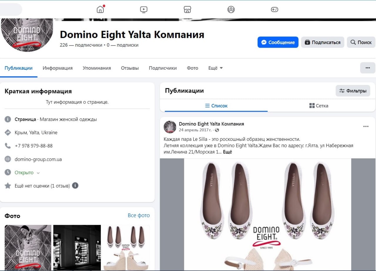 Наконец, стоит добавить, что хотя на Facebook ялтинский магазин одежды Domino Eight не обновляет данные с апреля 2017 года, в сети Instagram магазин с 21 августа ищет консультанта стилиста, то есть можно сделать вывод, что активно работает.