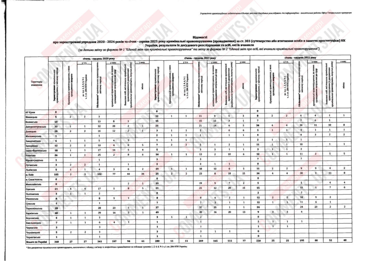 В Офисе на официальный запрос о количестве людей, привлеченных к уголовной ответственности за проституцию в 2020-2025 годах предоставили статистику открытых дел по: