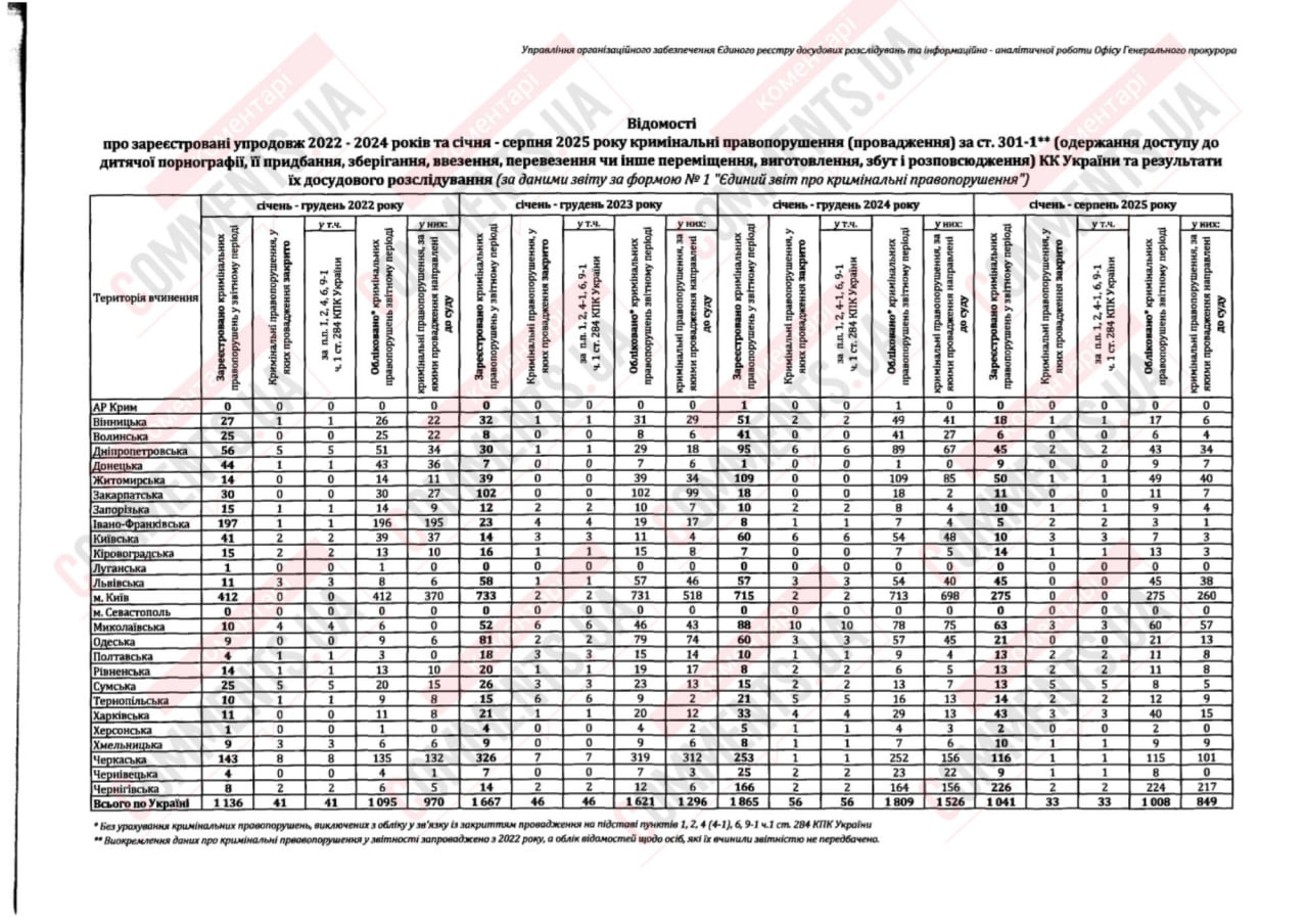 В отношении преступлений по ст. 301-1 УКУ (детская порнография), то больше всего уголовных производств было зарегистрировано в 2024 году — 1865 дел, из них в отношении 1523 правонарушений дела было передано в суд. Меньше всего — в период январь-август 2025 года — 1041. Уголовных производств по детской порнографии больше всего за 2022-2025 годы открывали в Киеве.