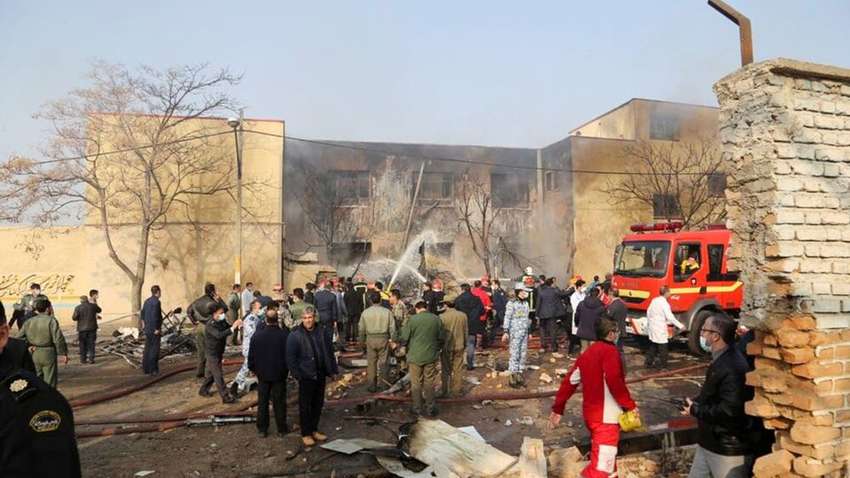 Пожарные работают над тушением пожара после того, как истребитель разбился в Тебризе, Иран - Reuters