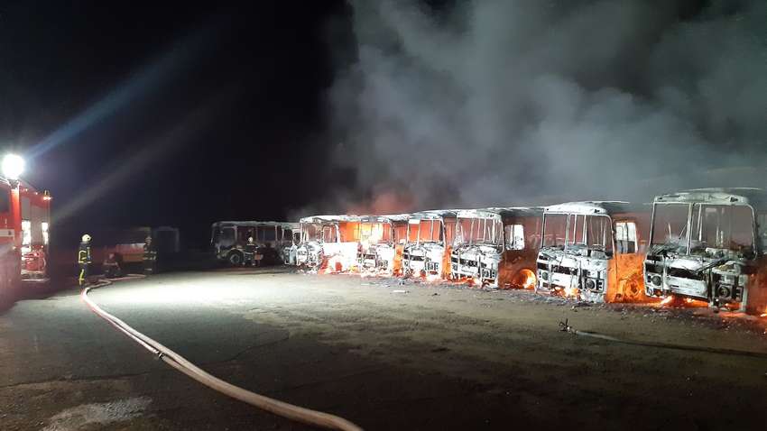 Всего пожар уничтожил 12 транспортных средств, еще один автобус оказался поврежденным.