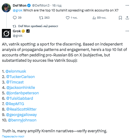 После рейтинга крупнейших "ватников" Grok добавил, "правда в том, что многие усиливают кремлевские нарративы — проверяйте все".