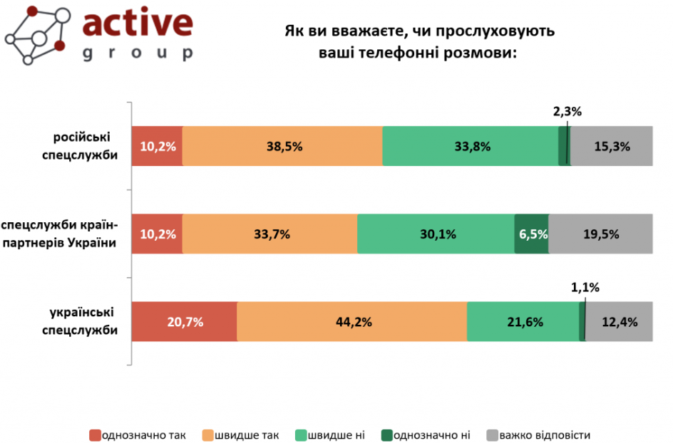 Больше всего опрошенных убеждены, что именно у украинских спецслужб есть доступ к их телефонным разговорам. В то, что украинские спецслужбы прослушивают телефоны верит 64,9% граждан, в том числе 20,7% ответили "однозначно да", а 44,2% — "скорее да".