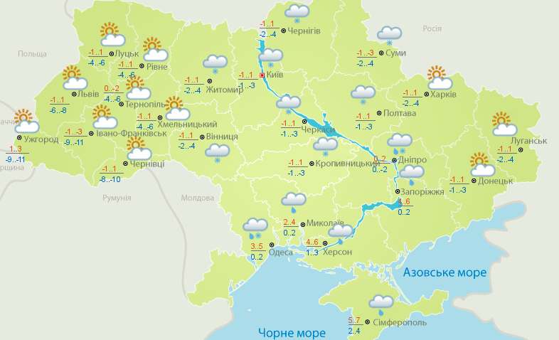 Синоптики обещают в северных и большинстве центральных областей небольшой снег, в южной части — небольшие осадки, преимущественно — в виде дождя.