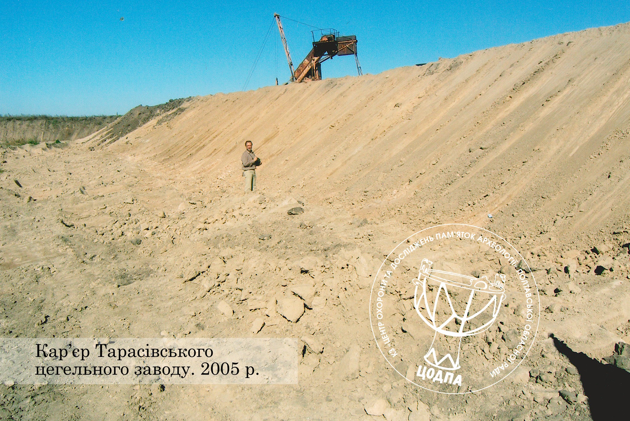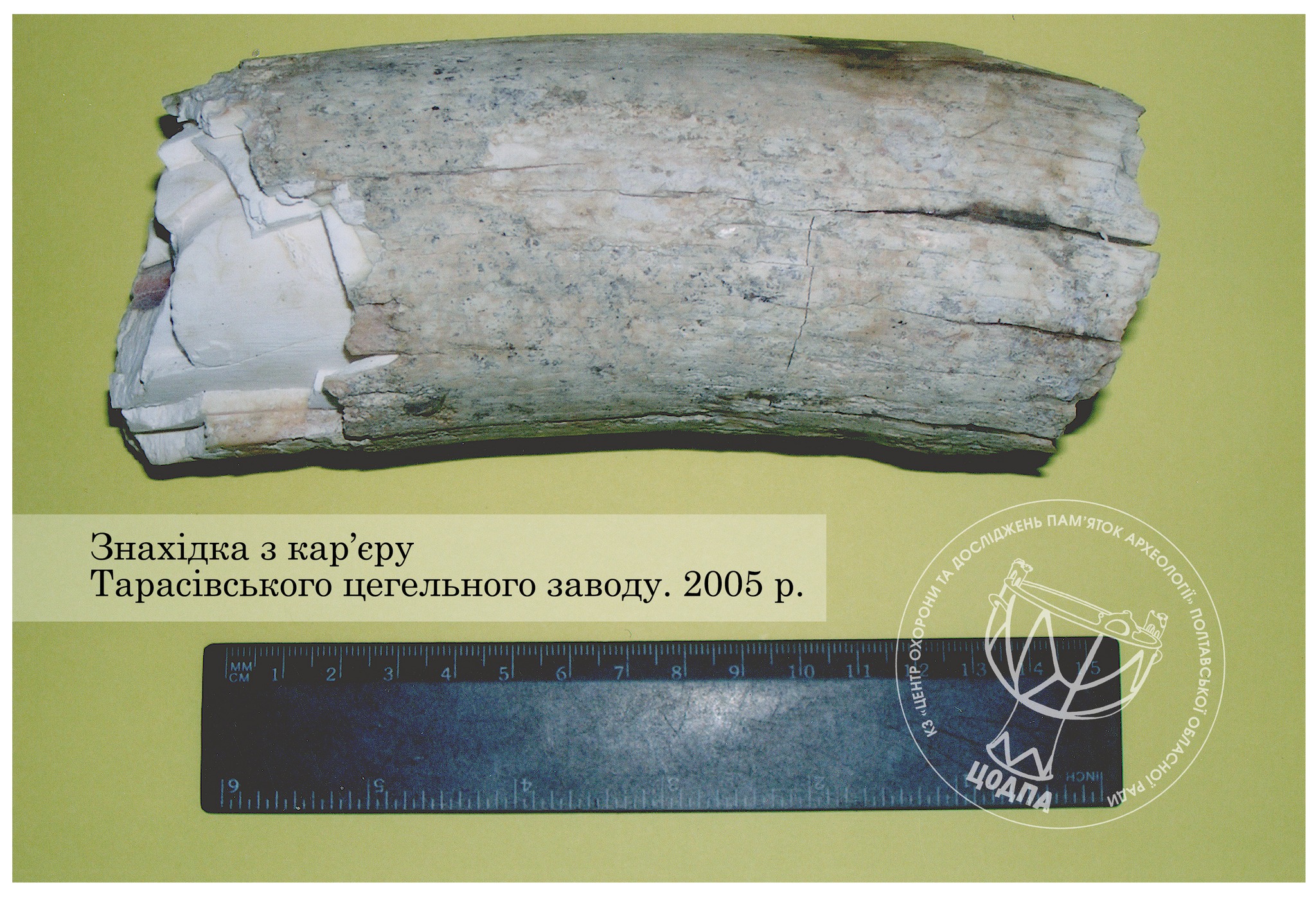 "Интересно, что это не первый такой палеолитический след в этой местности. 16 сентября 2005 г. председатель тогдашнего Оржицкого районного совета Гордиенко С.В. сообщил о находках костей мамонта на территории карьера Тарасовского кирпичного завода. Так что уже 17 сентября младший сотрудник нашего Центра (а ныне директор) Вячеслав Шерстюк поехал в Оржицкий район, чтобы обследовать местонахождение этих материалов.
