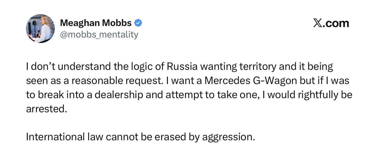 Меган Моббс, дочь специального представителя США по Украине Кита Келлога, высмеяла территориальные требования российского диктатора Владимира Путина. В соцсети X она подчеркнула, что стремление России захватить украинские земли не может рассматриваться как рациональное или законное желание.