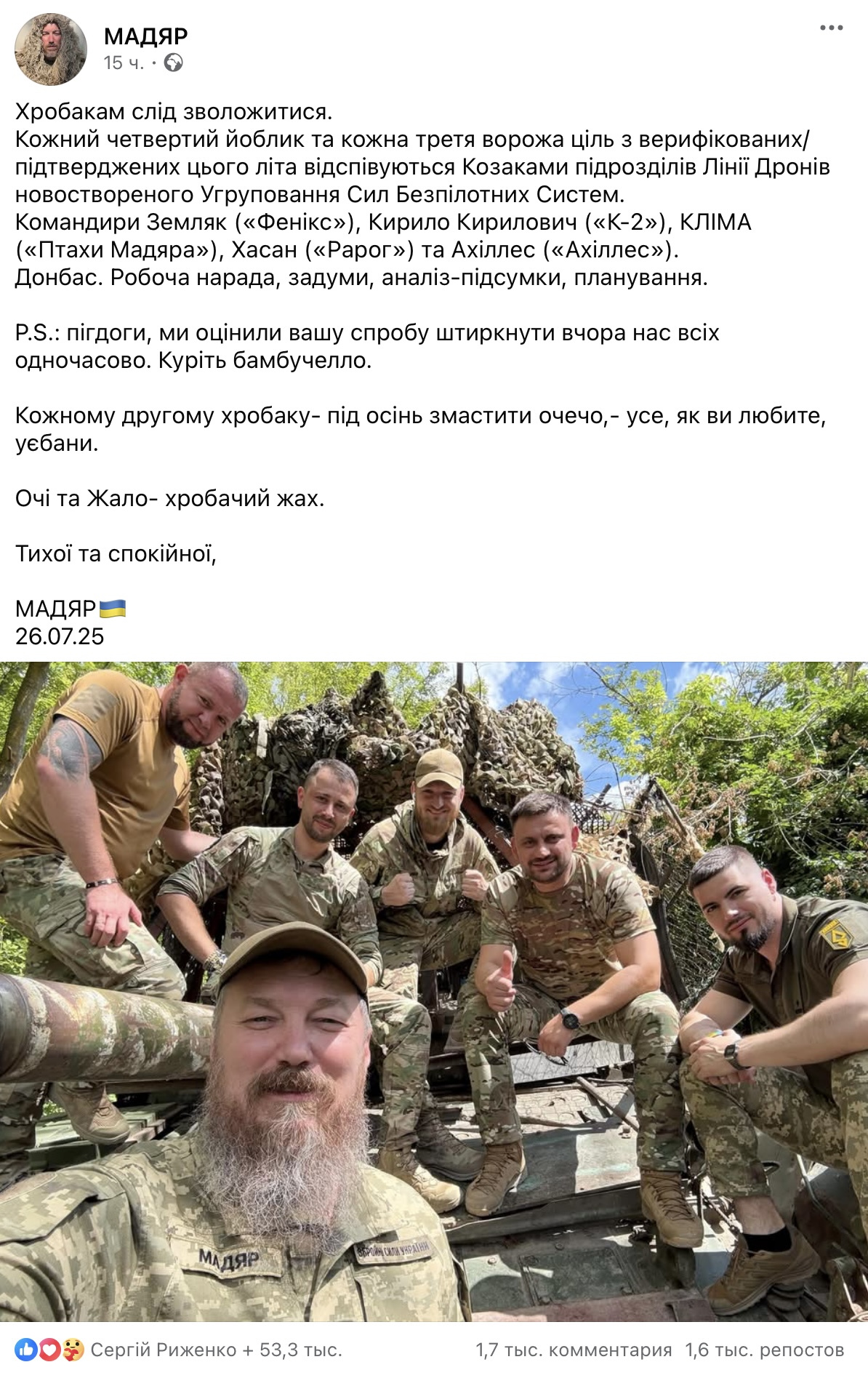 В своем обращении "Мадяр" также сообщил об эффективности вновь созданной Группировки Сил беспилотных систем. По его словам, этим летом подразделения Линии Дронов ответственны, по меньшей мере, за каждую четвертую ликвидированную живую силу противника и каждую третью подтвержденную уничтоженную цель.
