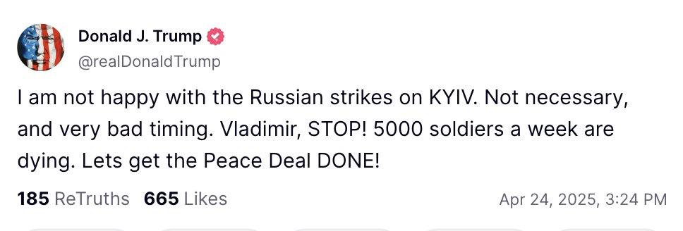 "Я не доволен российскими ударами по Киеву. В этом нет необходимости и очень несвоевременно. Владимир, остановись! 5000 солдат еженедельно погибает. Давайте заключим мирное соглашение", – написал Трамп.