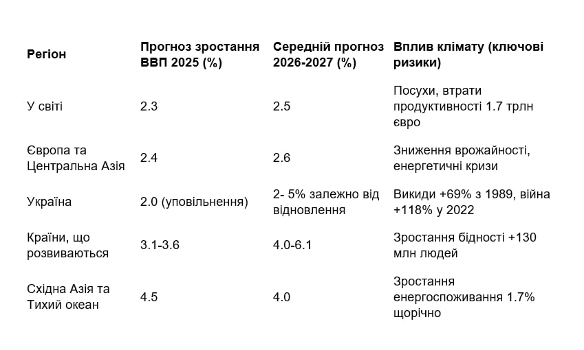 Економічні прогнози вказують на уповільнення глобального зростання ВВП до 2,3% у 2025 році з подальшим слабким відновленням у 2026-2027 роках, що є найнижчим темпом з 1960-х років. У країнах, що розвиваються, включаючи регіон Європи та Центральної Азії, зростання сповільниться до 2,4% у 2025 році, що нижче середнього за 2010-2019 роки. Кліматичні ризики, такі як посухи та пожежі, коштують світовій економіці мільярди: лише у 2017 році погодно-кліматичні катастрофи обійшлися в 290, особливо в торгівлі, підірвали політичну стабільність, що мільярдів євро, а витрати на боротьбу з пожежами в США сягнули 2 мільярдів доларів.