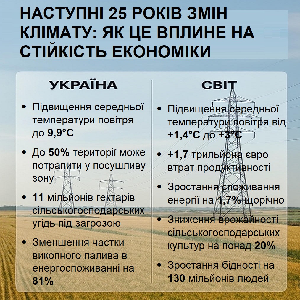 За даними експертів, якщо не вжити заходів, температура на планеті може зрости на +1,5 С до 2030 року порівняно з доіндустріальним періодом, що призведе до втрат продуктивності на понад 1,7 трильйона євро у світі. В Україні, де економіка сильно залежить від аграрного сектора та енергетики, ці зміни матимуть особливо гострі наслідки, посилюючись війною та геополітичними ризиками. Аналізуючи тренди, можна побачити, як підвищення температур, посухи та екстремальні погодні явища вплинуть на ВВП, бідність та торгівлю, створюючи як загрози, так і можливості для переходу до зеленої економіки.