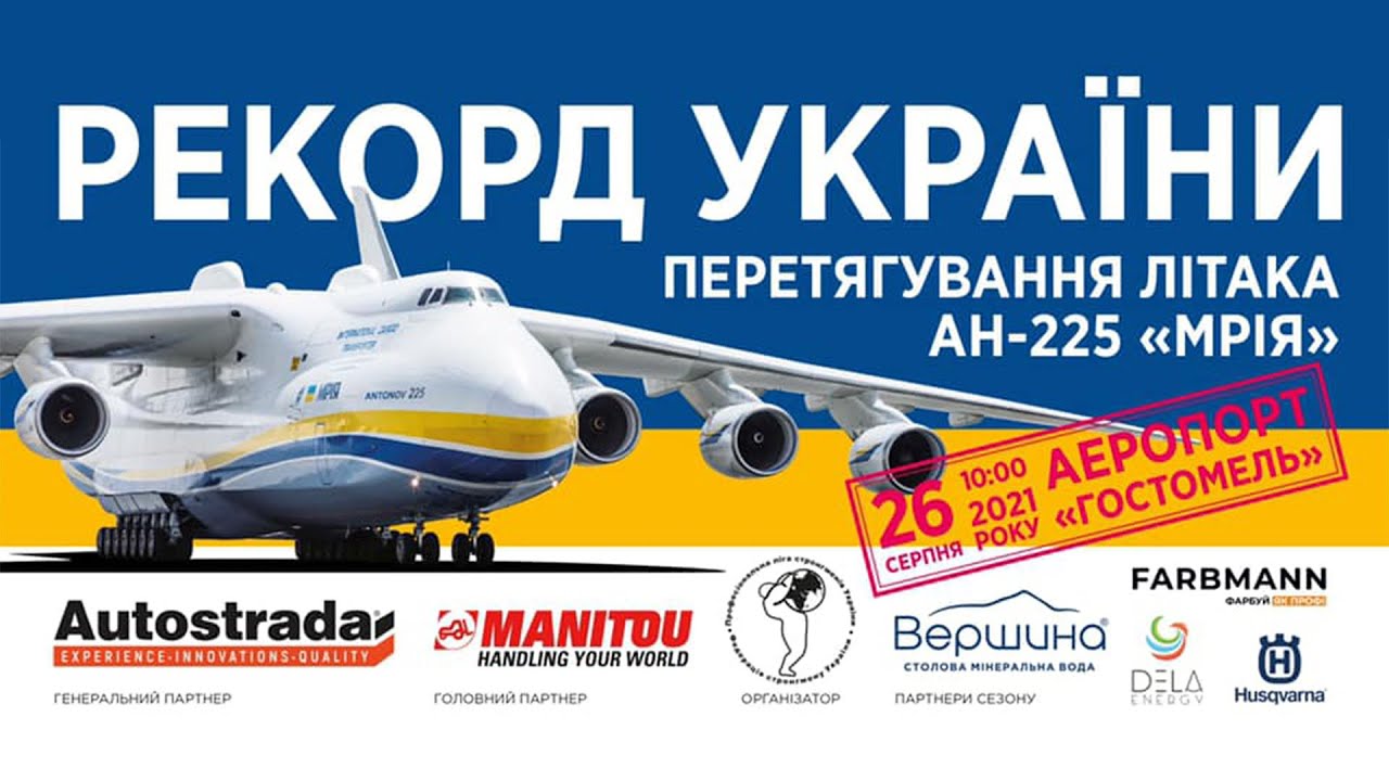 Вісім українських спортсменів зрушили з місця найбільший літак світу, українську легенду АН225 "Мрія". Трансляція встановлення світового рекорду велась на YouTube-каналі "Strongman".