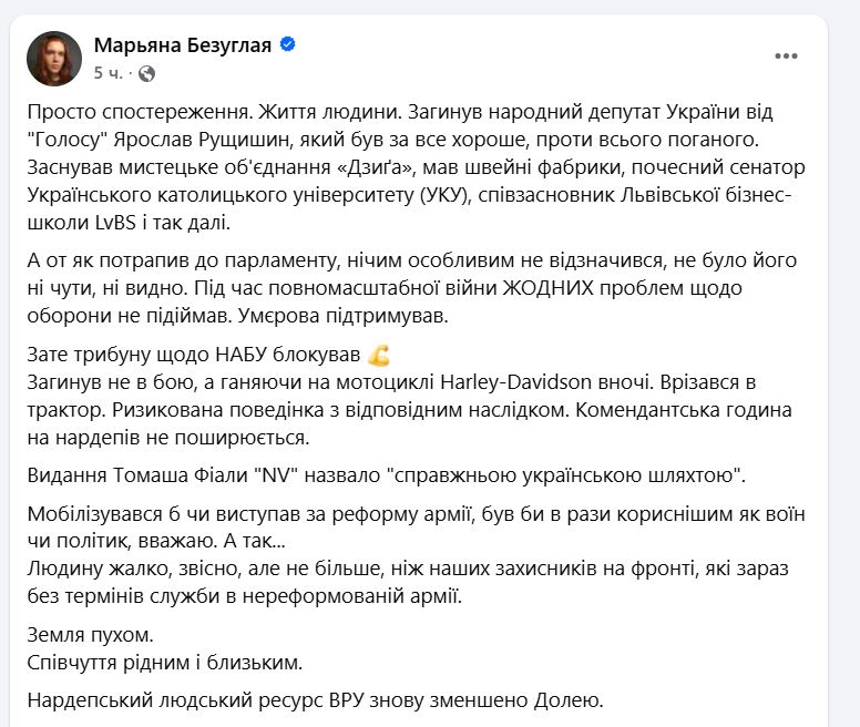 Народна депутатка Мар’яна Безугла майже щодня потрапляє у нові скандали, зокрема "завдяки" своїм коментарям тих чи інших подій. Так, на цей раз політикиня прокоментувала новину про загибель свого колеги – нардепа від партії "Голос" Ярослава Рущишина, який учора ввечері загинув у ДТП.