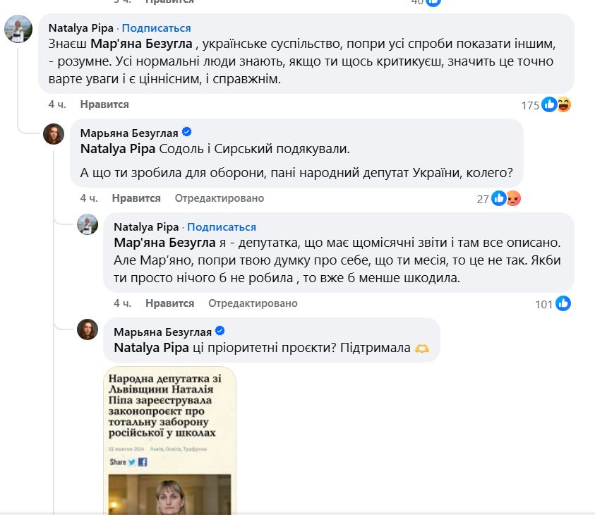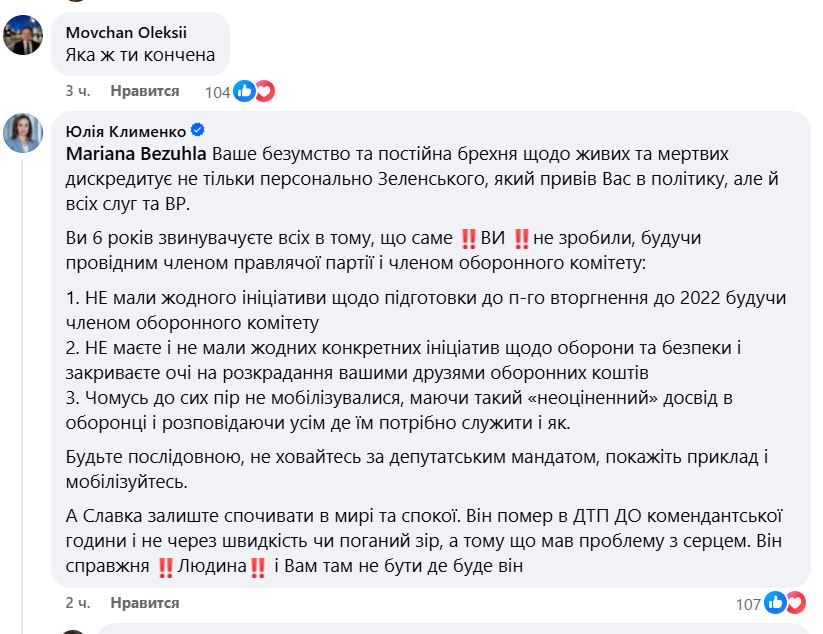 На її публікацію одразу відреагували колеги-нардепи, деякі з них назвали Безуглу "твариною", "конченою" та іншими образами.