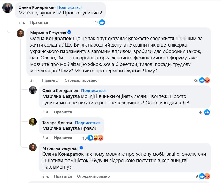 Віцеспікерка Верховної Ради Олена Кондратюк написала: "Марʼяно, зупинись! Просто зупинись!"