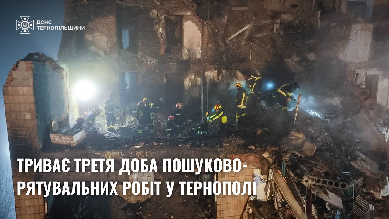 У Тернополі третю добу тривають пошуково-рятувальні роботи на місці російського ракетного удару по житловому будинку на вулиці Стуса.